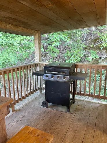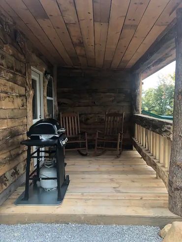 back porch with gas grill and 2 rocking chairs with views of the valley. No pets allowed.